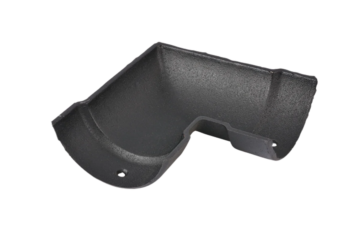 Cast iron standard half round gutter angle is part of a complete system that is attached to a roof of a house or building that collects and directs rainwater away from the roof and eaves into a vertical pipe discharge system