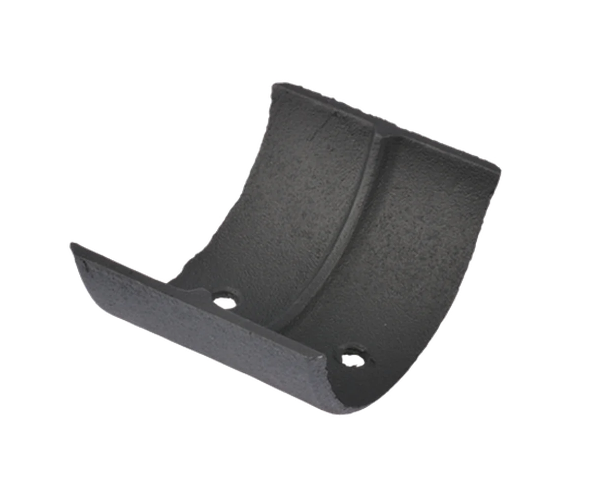 Cast iron standard half round gutter union clip is part of a complete system that is attached to a roof of a house or building that collects and directs rainwater away from the roof and eaves into a vertical pipe discharge system.