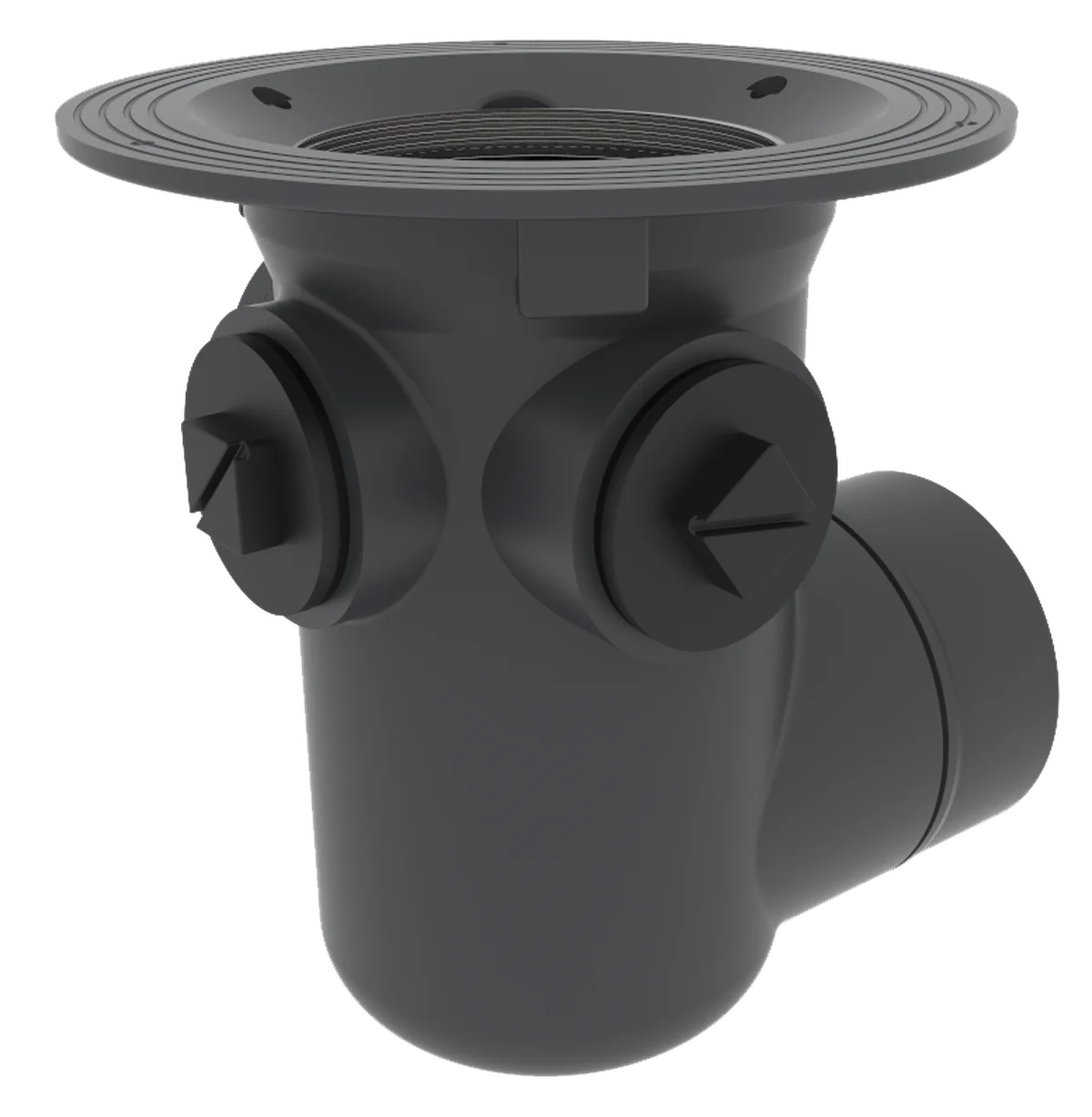 The VortX cast iron P trap has a unique flange design with 4 identification rings that provides a key for the waterproofing membrane or final floor finish, and has dimples to assist drilling location for fixing to the structural floor removing the requirement for a deck clamp.