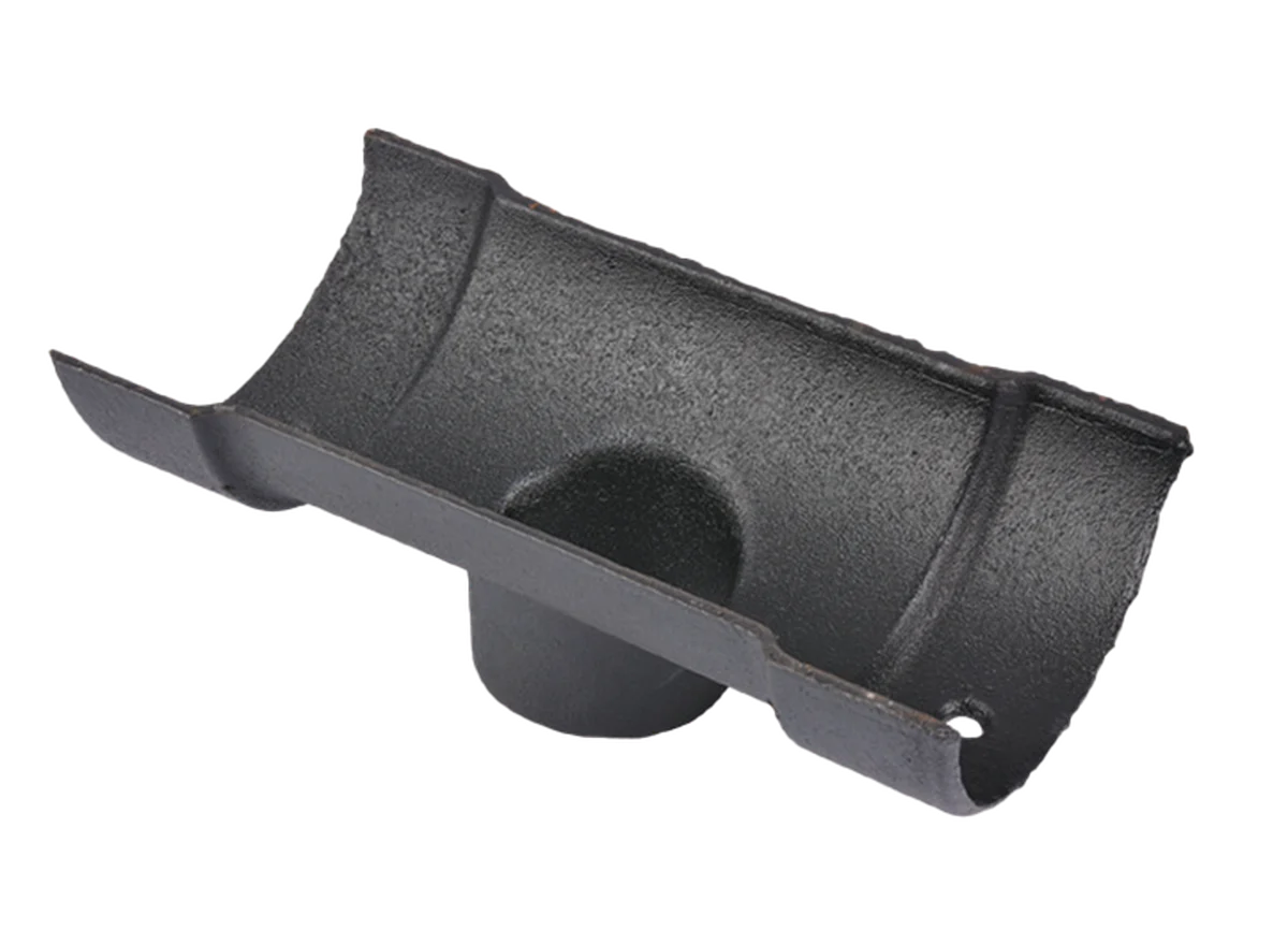 Half round gutter nozzle is part of a complete system that is attached to a roof of a house or building that collects and directs rainwater away from the roof and eaves into a vertical pipe discharge system