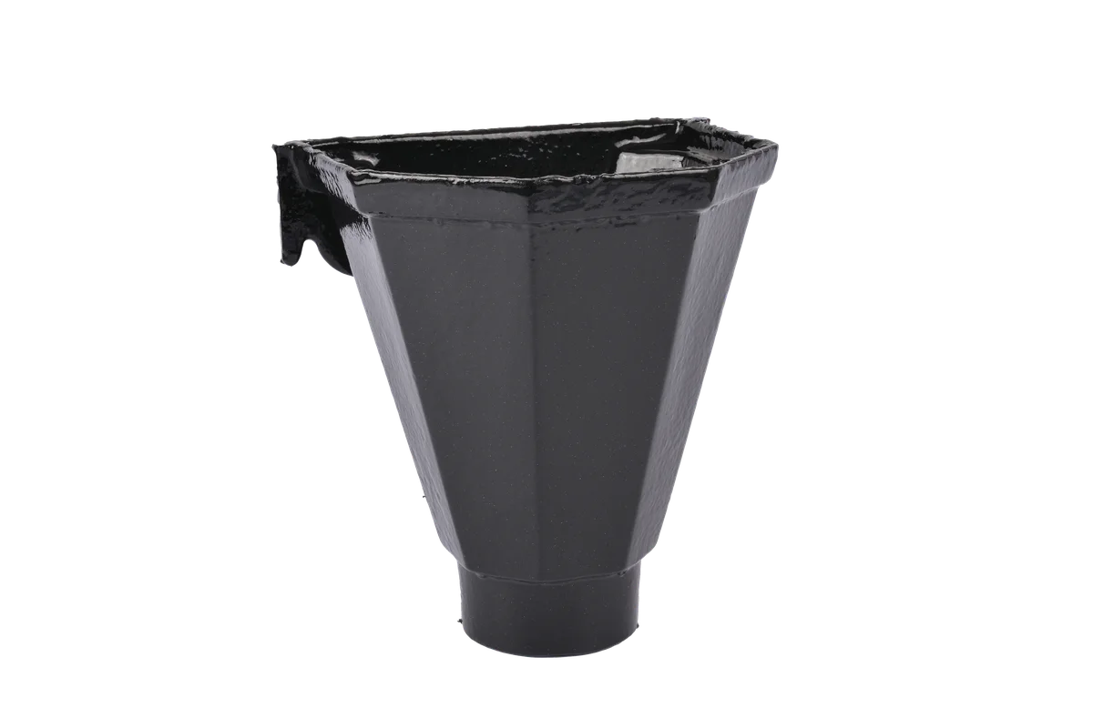 Small cast iron rainwater hopper head that collects and in heavy rainfall increases the discharge flow into the pipe system.