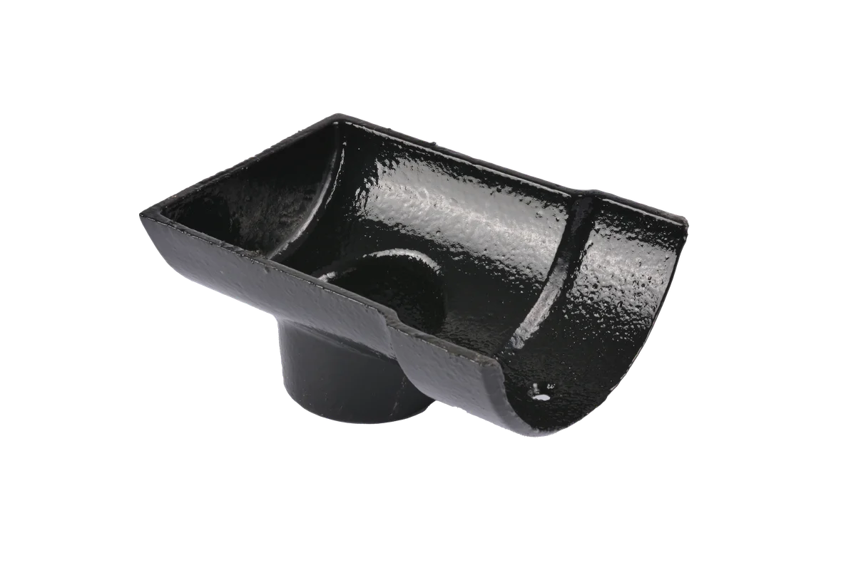 Cast iron standard half round gutter dropend is part of a complete system that is attached to a roof of a house or building that collects and directs rainwater away from the roof and eaves into a vertical pipe discharge system.