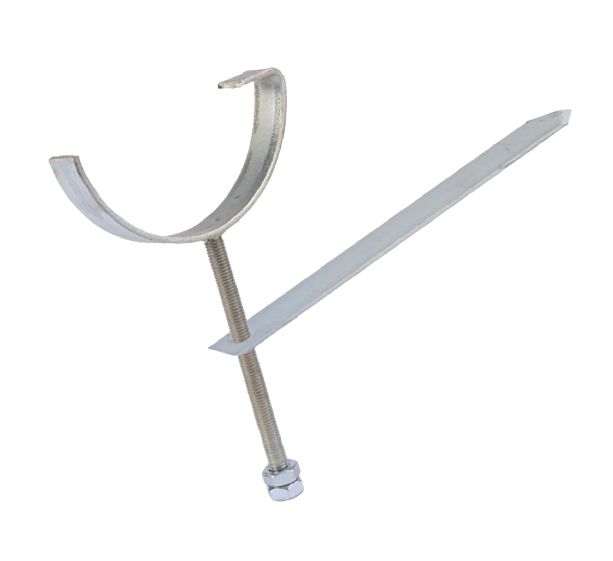 Half round gutter galvanised mild steel rise and fall brackets with retaining lip are part of a complete system that is attached to a roof of a house or building that collects and directs rainwater away from the roof and eaves into a vertical pipe discharge system.