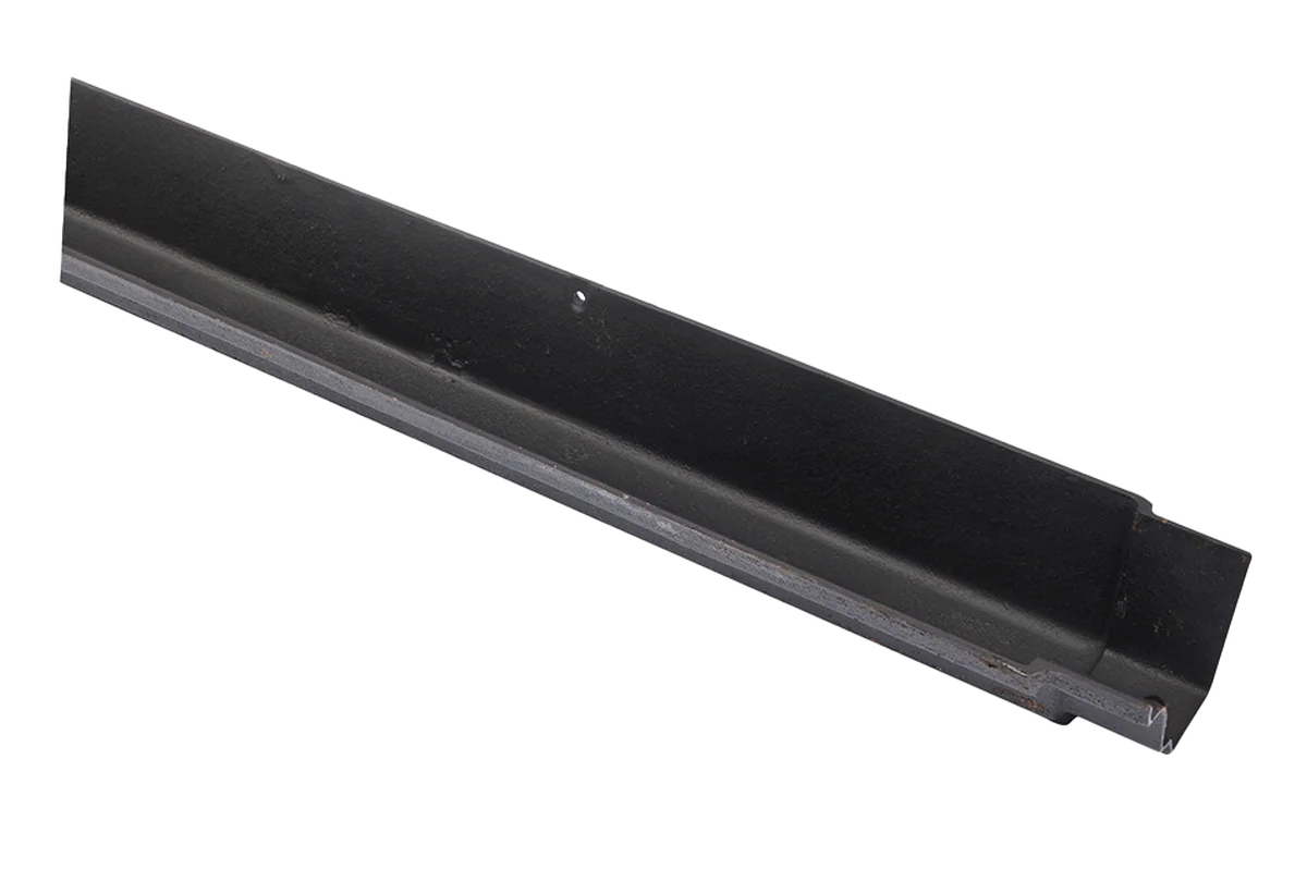 Cast iron moulded gutter that is attached to a roof of a house or building that collects and directs rainwater away from the roof and eaves into a vertical pipe discharge system.