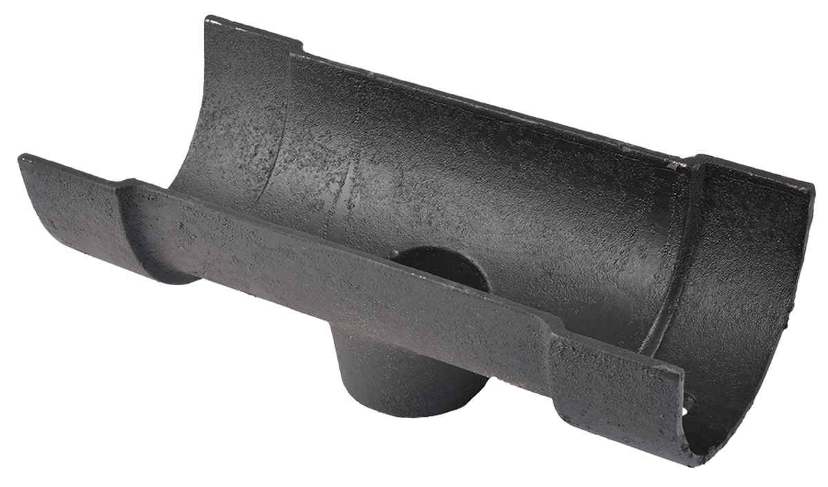 Cast iron deep half round gutter nozzle is part of a complete system that is attached to a roof of a house or building that collects and directs rainwater away from the roof and eaves into a vertical pipe discharge system.