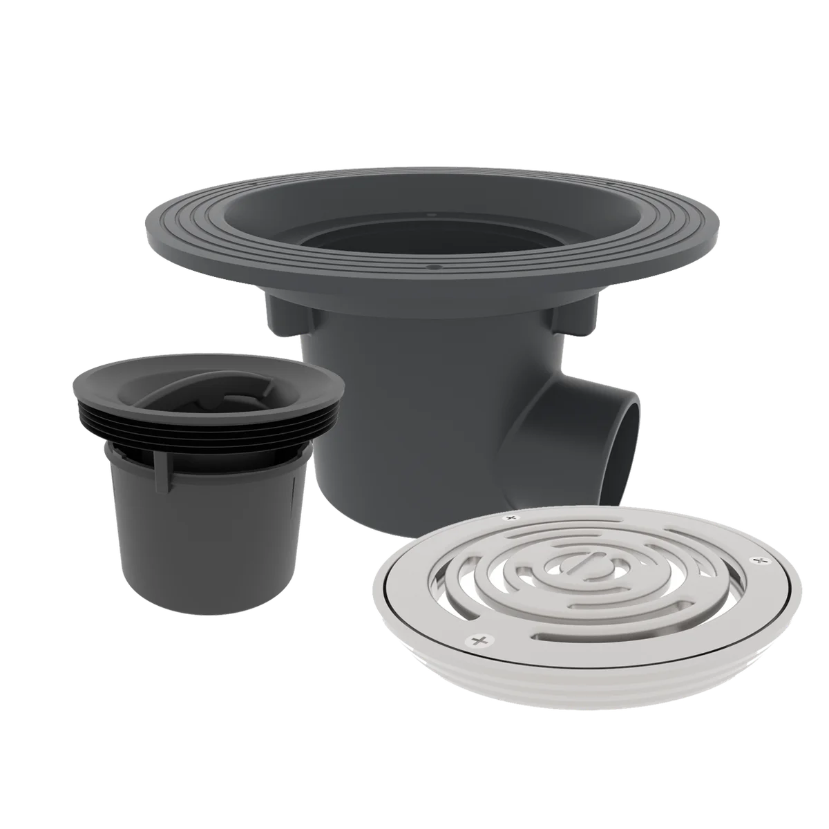 The VortX cast iron horizontal shower drain body has a unique flange design with 4 identification rings that provides a key for the waterproofing membrane or final floor finish, and has dimples to assist drilling location for fixing to the structural floor. VortX 150mm stainless steel square gratings with a K3 load class. For use with tiled floor finishes supplied with standard screws. To allow access of water from showers.